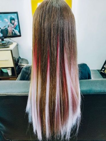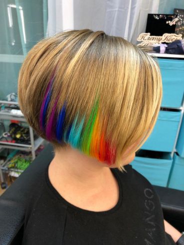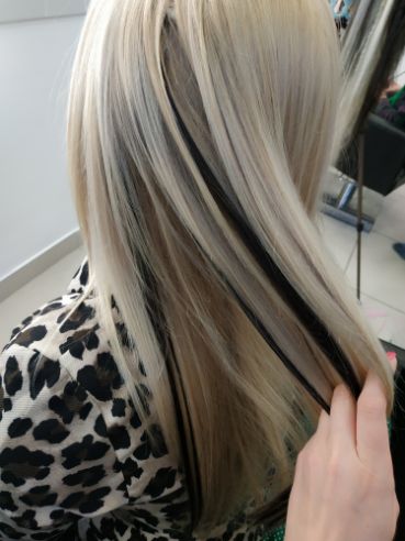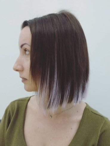 Нарощенные прядки подрезаются под длину своих волос или чуть ниже, прядки филируются.